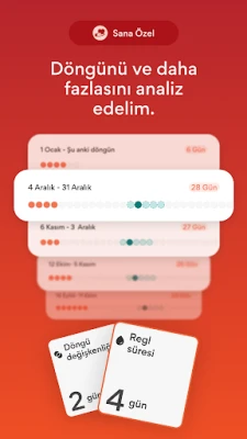 Girilen verilerle size özel olarak şekillenen kapsamlı analiz motorumuz sayesinde döngünüzün derinliklerine inin. Geçmiş kayıtlarınızdan öğrenerek bireysel kalıplarınızı ortaya çıkaran bu akıllı sistem, geleceğe yönelik adet ve yumurtlama dönemi tahminlerini dinamik bir şekilde günceller. Artık önemli günlerinizi önceden bilerek sosyal aktivitelerinizi, seyahatlerinizi veya sağlık kontrollerinizi kolayca planlayabilir, hayatınızın kontrolünü daha güçlü bir şekilde elinize alabilirsiniz.
