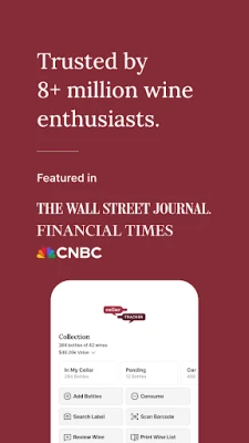 CellarTracker, 4.9 yıldızla en beğenilen şarap uygulamasıdır. 13.6 milyondan fazla şarap derecelendirmesi ve yorumuna sahip bu uygulama, dünya genelinde 8.8 milyondan fazla kullanıcının 21 milyar dolarlık şarap koleksiyonunu ve milyonlarca kişisel anısını 20 yılı aşkın süredir takip ediyor.